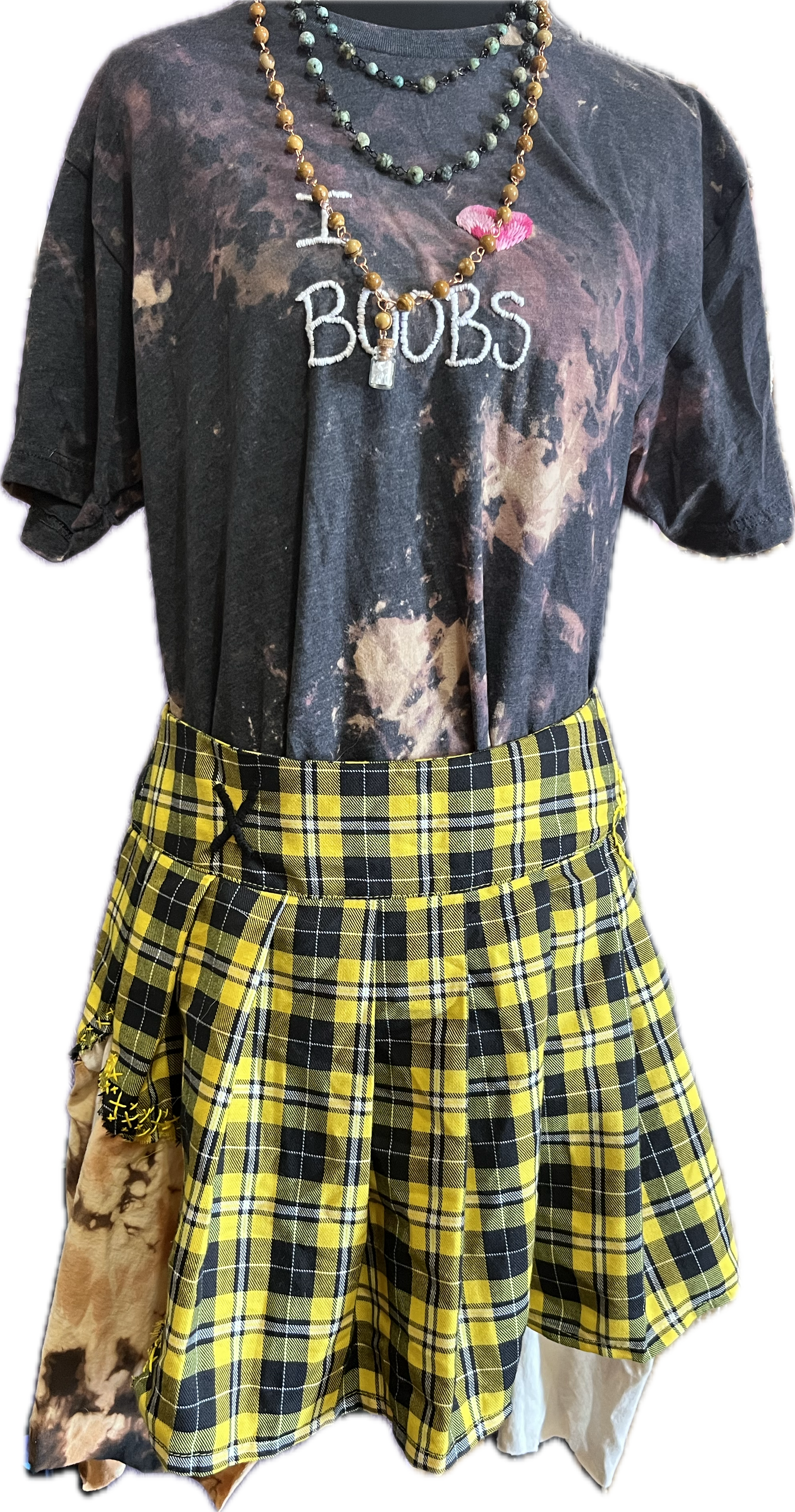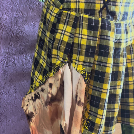 Medium yellow plaid skirt with hand embroidered embellishments and t shirt fabric.