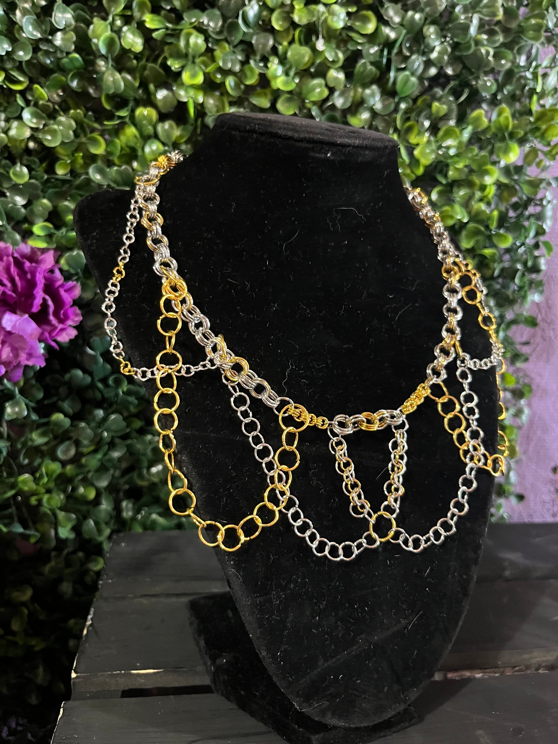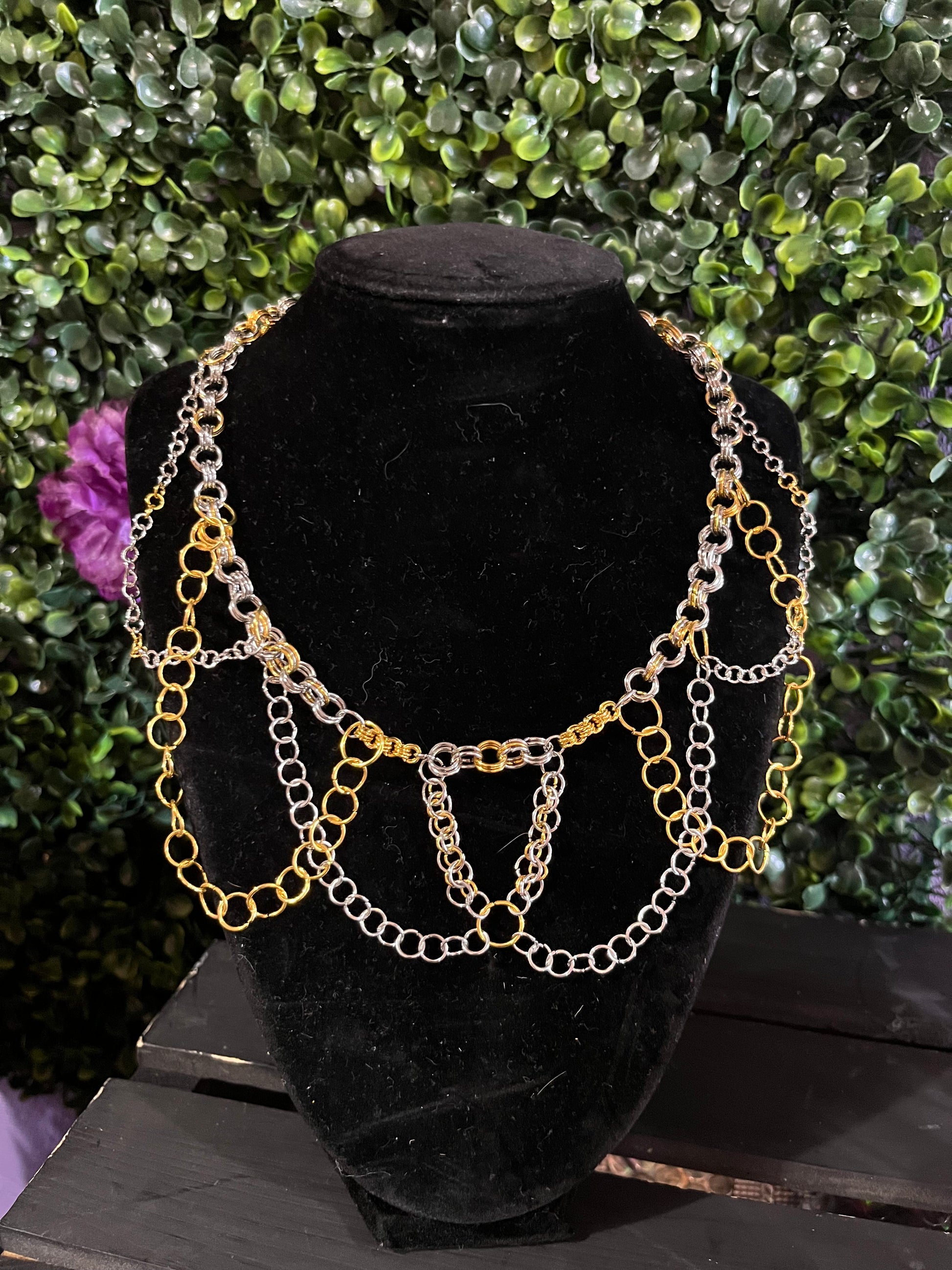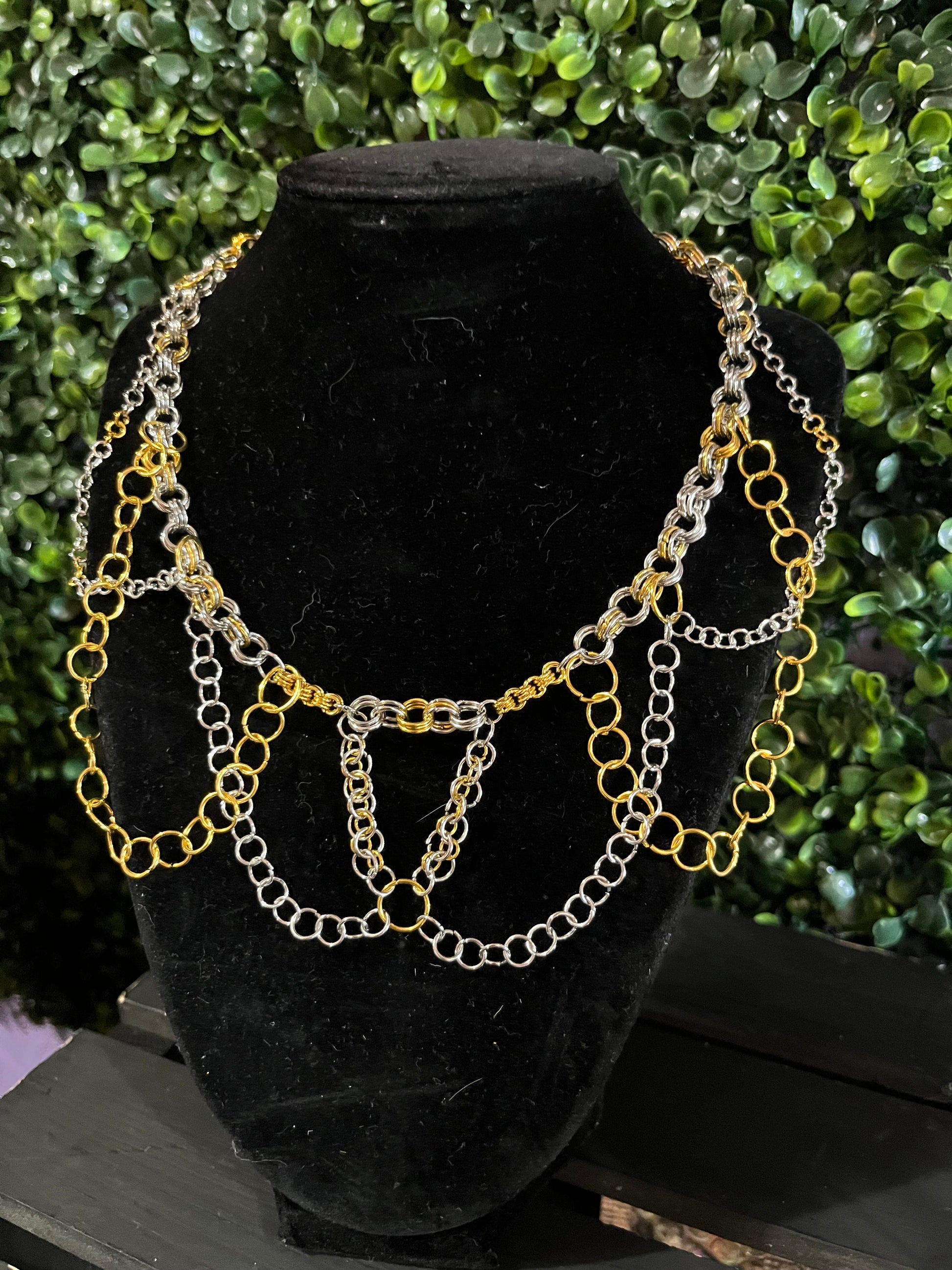 Handmade chainmaille statement necklace with gold and silver jump rings and adjustable length chain with lobster claw clasp