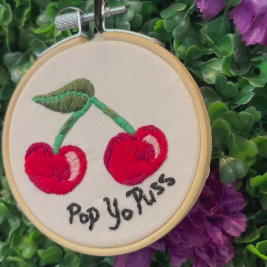 Hand-sewn original design on muslin fabric with embroidery floss on 3 inch bamboo embroidery hoop