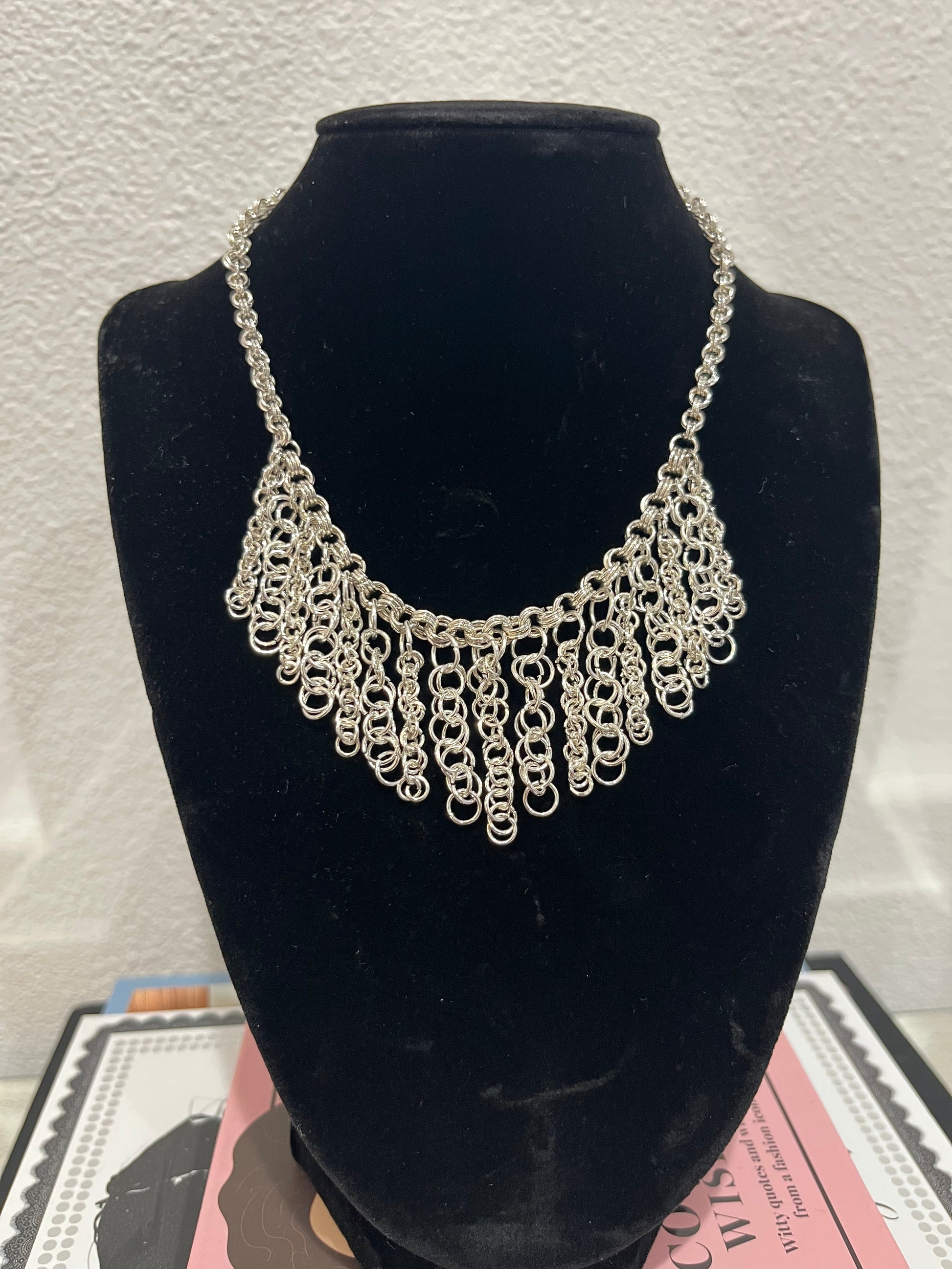 Handmade silver-plated chainmaille necklace with lobster claw clasp.