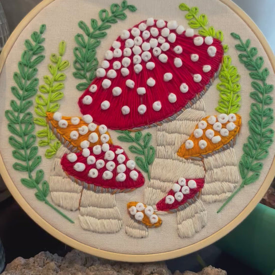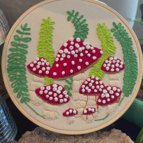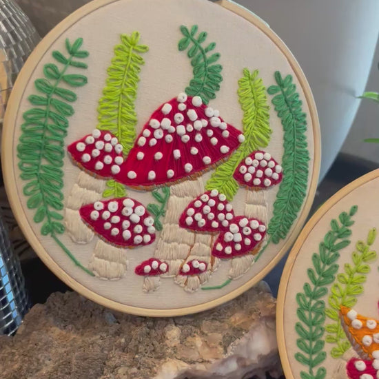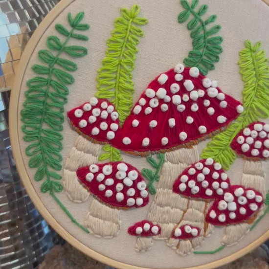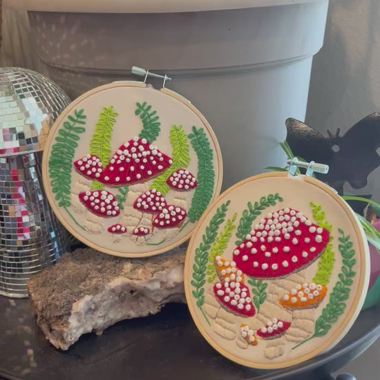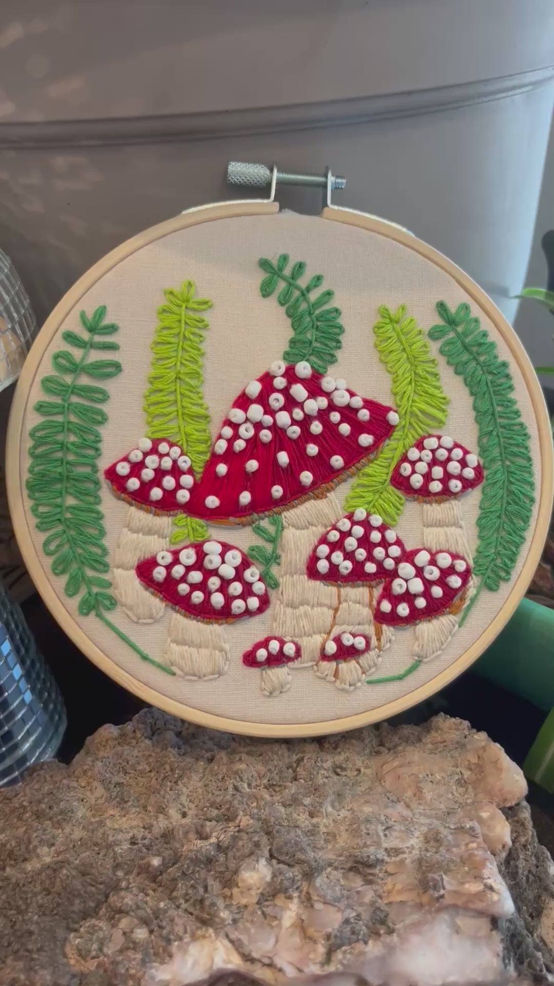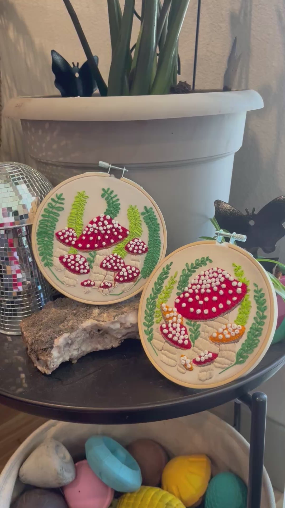 Hand-sewn original designs on muslin fabric with embroidery floss and glass seed beads with a 5” bamboo embroidery hoop